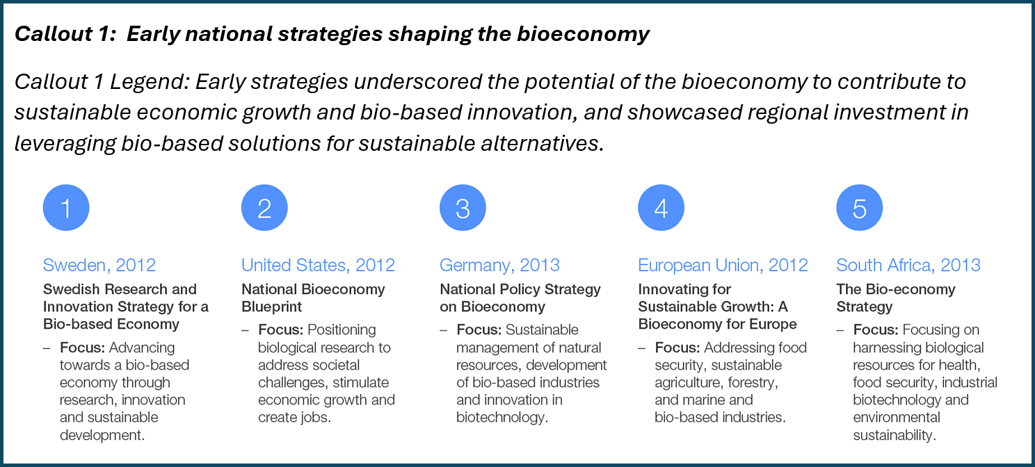 Governments play a key role in infusing innovation into society and directing investment in sustainable commercial alternatives. Based on the potential of the bioeconomy to boost economic growth and deliver societal benefit, governments around the world have been drafting national bioeconomy strategies since the early 2010s. Sweden, the United States, Germany, the European Union and South Africa were some of the first to publish national bioeconomy strategies starting in the early 2010s (Callout 1). Many countries have since followed suit.