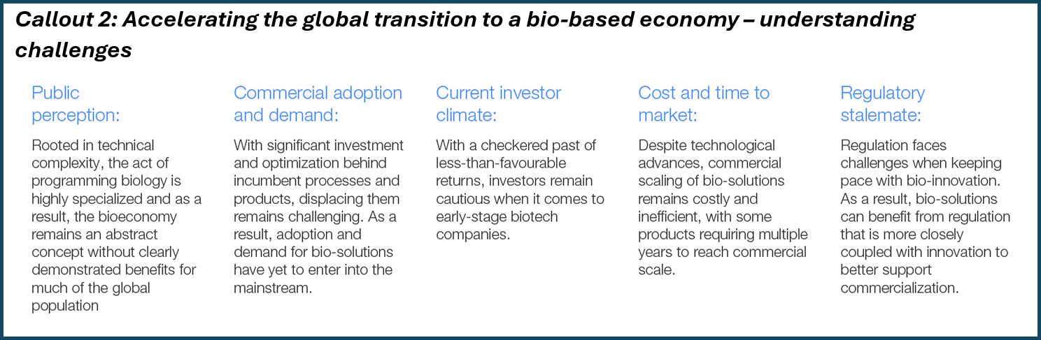 This article provides an overview of national strategies, as well as the key barriers preventing the bioeconomy from entering the commercial mainstream and becoming widespread across regions and societies. It also examines the potential of policy to amplify bio-innovations and unlock national strategies, and outlines key steps for enhancing commercial implementation, ultimately setting the stage for stakeholders to align on collective actions and accelerate the global transition to a bio-based economy.