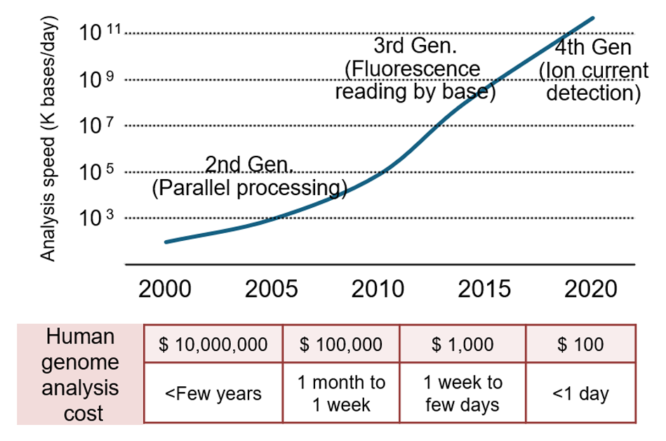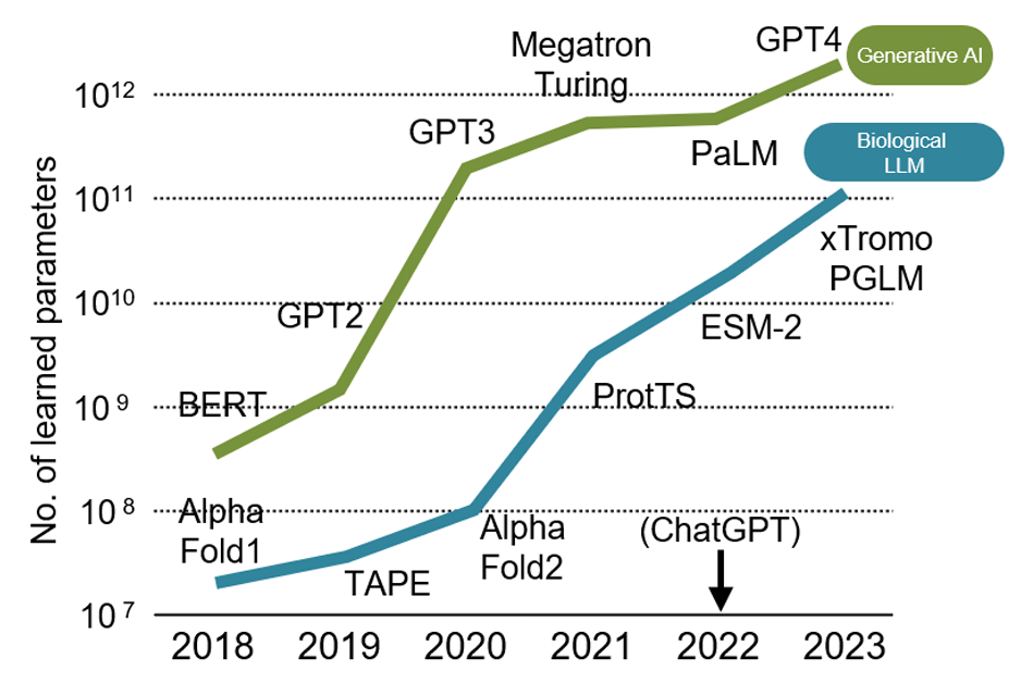 In the six years since, biotechnologies have progressed beyond research to practical and social applications, spurred on by new digital advancements and growing social demands. For example, in bio-measurement technology, sequencers that analyze DNA base sequences have continually improved, evolving from fluorescence-based measurement to electric-current-based technologies, enabling rapid reading of long base sequences. Today, this allows for the human genome to be sequenced affordably and quickly, within a single day at a cost of just $100 (Fig. 1). Additionally, advances in digital technology, such as deep learning and generative artificial intelligence (AI), have broadened applications in the bio sector. Specifically, biochemical data such as amino acid sequences and protein structures, along with academic literature, are now used to train large language models (LLMs) specialized for biochemistry. Generative AI based on these biochemistry-focused LLMs has reached a practical level for researchers where it can read genomic information as a language and interpret the meaning and functions of genes contained in the genome (Fig. 2). Societal demands are also accelerating the implementation of biotechnologies. During the COVID-19 pandemic in 2019, the urgent need for mass-produced vaccines led to the rapid development of messenger RNA (mRNA)*3 vaccines, with rollout beginning by late 2020. Approval processes that normally take years in the U.S. were fast-tracked in less than a year due to the pressing social need during the pandemic. Currently, biotechnology is undergoing transformation through digital × bio applications, primarily in healthcare, with the potential for BX to expand across various industrial sectors to address global challenges.