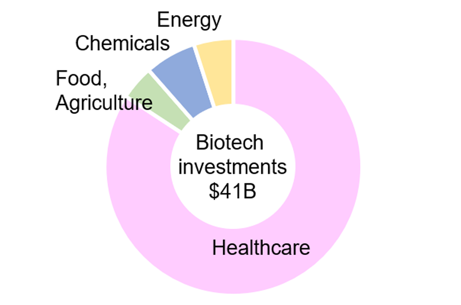 Currently, venture capital investment in biotech startups is concentrated in the healthcare sector (Fig. 3). However, investment is foreseen to expand into sectors such as food, agriculture, chemicals, and energy. This trend is reflected in the projected growth of the bioindustry market, which, by 2030 and beyond, is expected to reach a comparable scale across healthcare, food and agriculture, and chemicals and energy (Fig. 4).