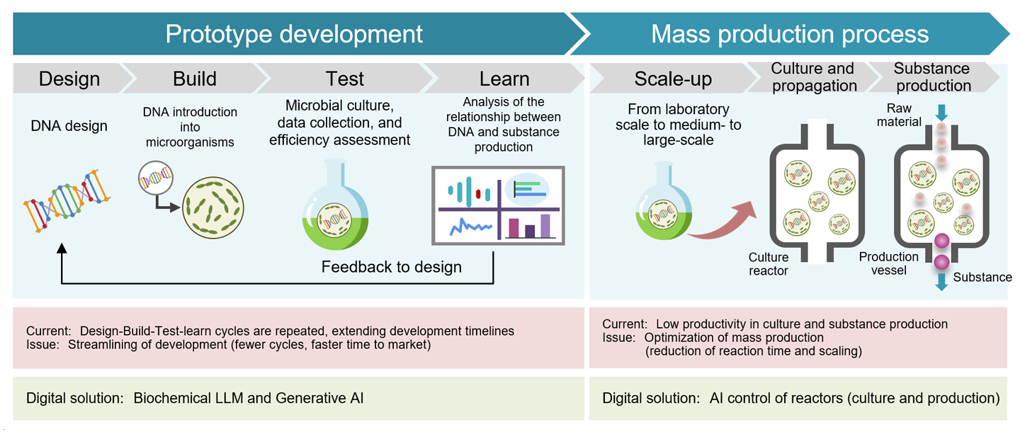During the mass production phase, microbes are cultivated and used to produce useful substances in large quantities. Challenges include unexpected microbial contamination or production of harmful substances, which can reduce microbial populations and impair production efficiency. Solutions involve optimally controlling conditions within microbial bioreactors (vessels for culturing or generating desired substances) through digital technology. Specifically, sensors measure environmental conditions (temperature, pressure, oxygen levels, pH, stirring speed, feedstock input, and product discharge rates) in real time in accordance with growth progress and production levels, while AI helps adjust conditions to optimize production and quality.