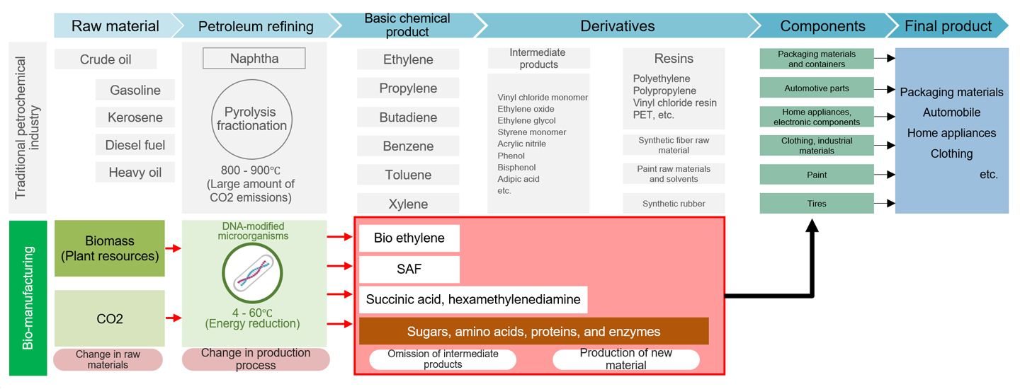 The widespread social implementation of bio-manufacturing is anticipated to significantly transform the structure of the manufacturing supply chain (Fig. 6). Traditional manufacturing that uses petroleum as raw material involves extracting crude oil, refining it into naphtha and fuel, and then breaking down the naphtha at high temperatures (above 800°C) to produce basic chemicals and derivatives. These chemicals are then processed into components and assembled into final products. In contrast, bio-manufacturing uses biomass (organic resources derived from biological sources, excluding fossil resources) or carbon dioxide (CO₂) as raw materials. Microorganisms metabolize these materials through processes like fermentation to produce chemicals. Since the bio-manufacturing process generally requires only room-temperature conditions, it can drastically reduce energy consumption. Additionally, bio-manufacturing enables direct production of desired chemicals from raw materials, bypassing intermediate products and shortening the supply chain, which also helps reduce CO₂ emissions.