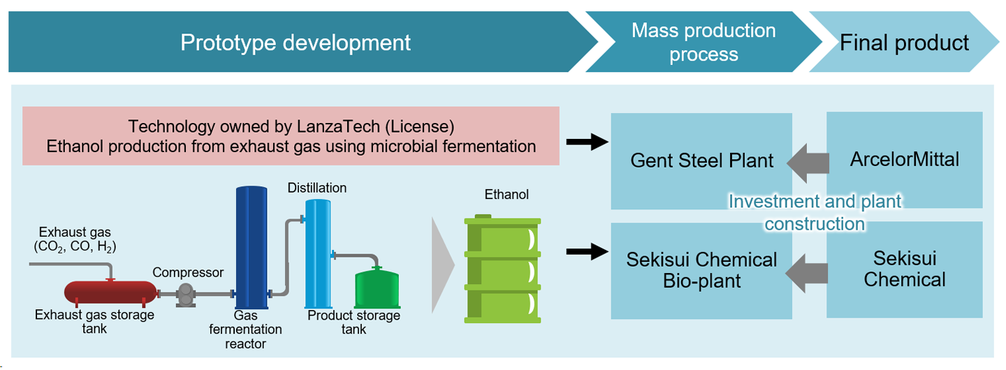 LanzaTech, for example, has developed technology using genetically modified microorganisms to produce bioethanol from CO₂, which it licenses to manufacturing companies to advance the social implementation of biotechnology (Fig. 7). Sekisui Chemical, a chemical manufacturer, operates a bio-plant under license from LanzaTech. Meanwhile, steelmaker ArcelorMittal has set up a plant in its steel factory to capture CO₂ emissions and produce bioethanol using LanzaTech’s technology. Thus, efforts to operate bio-manufacturing are becoming more prominent across various manufacturing fields.