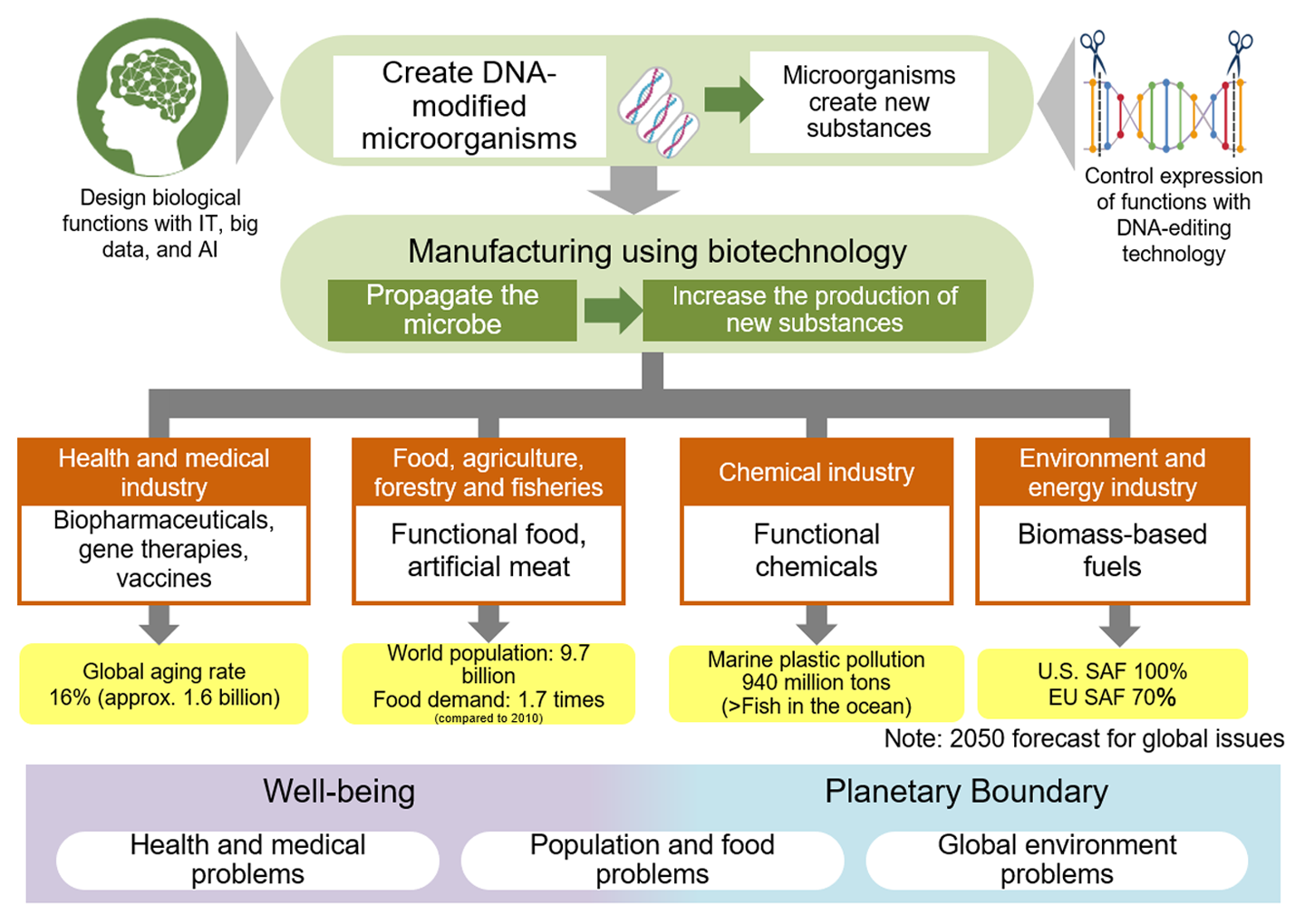 These solutions to global issues related to well-being and planetary boundaries through bio-manufacturing could also influence national security and industrial competitiveness. As bio-resources replace petroleum as the primary raw material and energy source, oil-producing nations may see a reduction in their national power, while the influence of grain-exporting countries rises. Additionally, developing countries, rich in genomic data from previously unknown microorganisms, could leverage this data to enhance their standing in the international community. Japan, with its abundant water and forest resources, is well-positioned to strengthen its industrial competitiveness through manufacturing using biotechnology.
