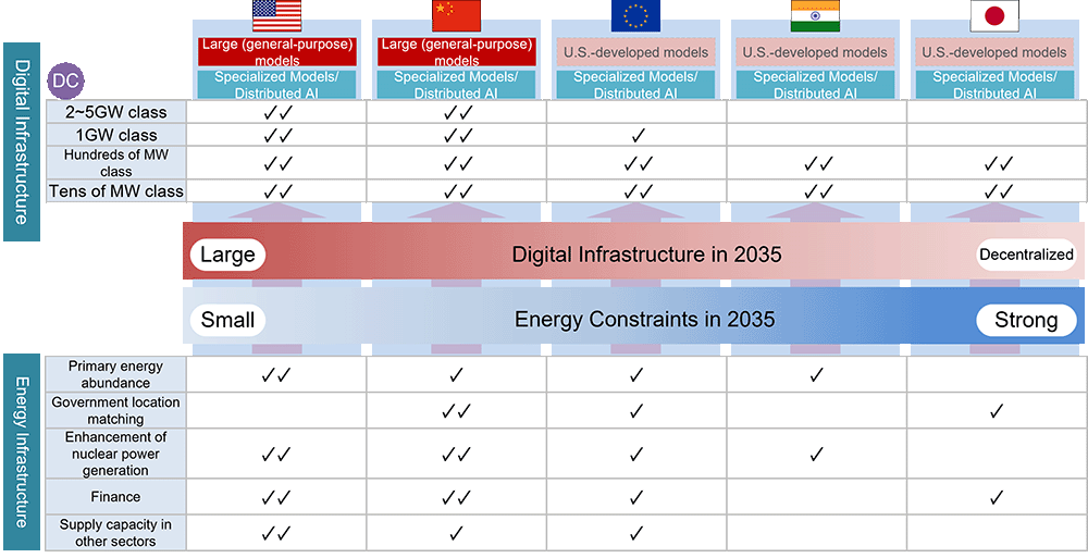 Figure 6 provides examples of digital infrastructure options based on regional energy constraints in 2035. The U.S. possesses abundant domestic resources, including natural gas, in addition to renewables. To minimize the impact of T&D grid development delays, there is a growing trend of on-site generation, where gas-fired power plants are co-located with DCs, leveraging the nation's extensive natural gas pipeline network. Furthermore, new nuclear development, including SMRs, is advancing, supported by direct investment and Power Purchase Agreements (PPAs) from Big Tech companies like Microsoft and Google. Consequently, even under the main scenario where federal decarbonization policy stalls (as described in 2.2), private-sector investment and development of specific technologies like SMRs will continue to accelerate, driven by AI demand and the imperative to bolster industrial competitiveness. This results in relatively low energy constraints, enabling the construction of large-scale digital infrastructure. Ultimately, this allows for the development and operation of large-scale foundation models in super-giant DCs (2+ GW), in addition to specialized and distributed AI in small- to medium-sized DCs.
