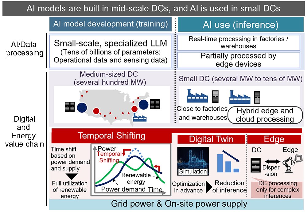 In manufacturing and logistics, operations and maintenance applications typically require specialized, smaller-scale AI models (tens of billions of parameters) trained on industry- specific or company-specific data. Crucially, the AI utilization phase demands real-time processing capable of second-by-second decision-making and control with on-site conditions. For these use cases, model training is performed at mid-sized DCs (hundreds of MW), while low-latency inference is achieved by deploying small-scale DCs in close proximity to the operational site, such as a factory. As the use of AI and robotics in factories increases, so does the load and power demand on these DCs. A critical challenge, therefore, is ensuring low-carbon operations through renewable energy to meet industrial decarbonization goals. Where processing times are flexible (e.g., production planning and forecasting), temporal load shifting becomes a viable option, aligning computational workloads with fluctuating renewable energy supplies. Furthermore, digital twins can be used to optimize production processes in advance, reducing the need for repeated inference. Edge computing can also be leveraged to execute simpler tasks on local devices (e.g., factory robots), reserving DC resources for complex computations. This hierarchical processing model helps suppress energy consumption peaks caused by processing concentration at the DC.