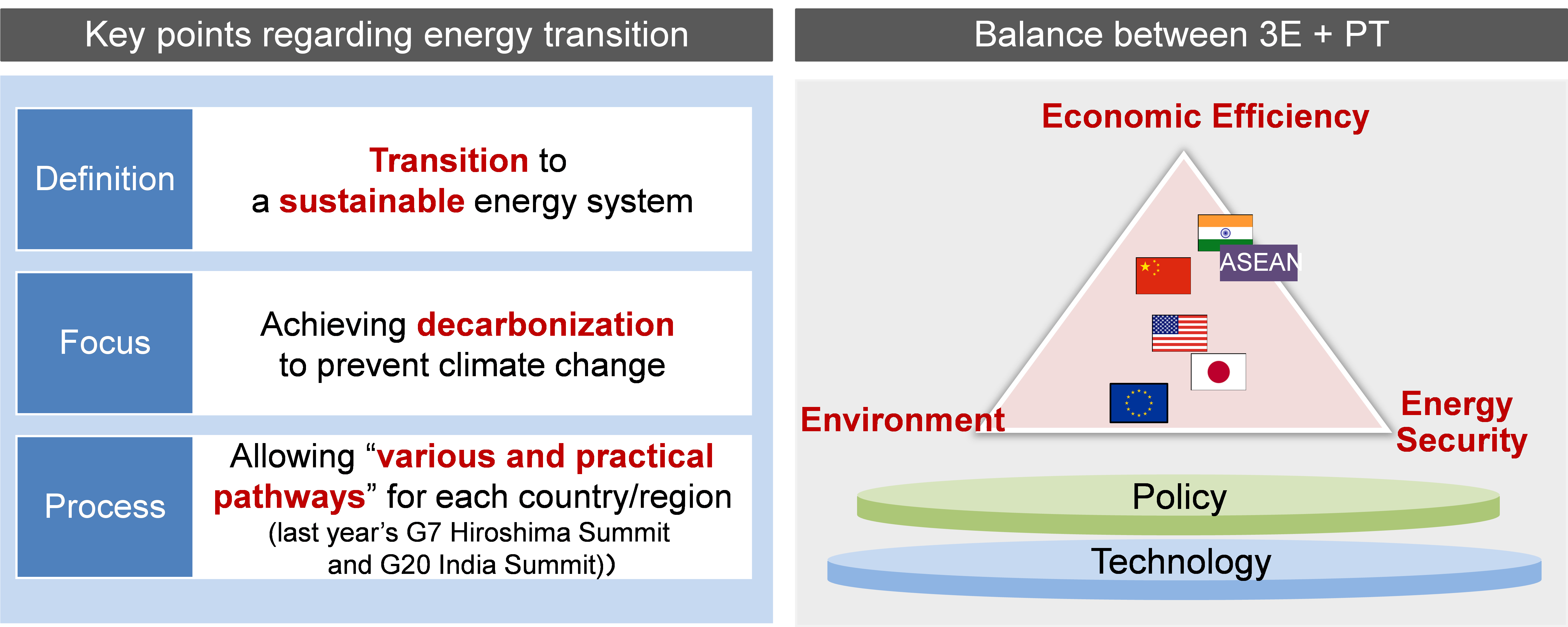 For example, the EU has launched the “European Green Deal” and is focusing on the “environment” in an effort to strengthen environmental policies within the EU while promoting green industries within the EU. In the meantime, China and India place emphasis on “economic efficiency” in a way that takes into account economic growth and the burden on their citizens while committing to net-zero emissions to fulfill their roles in the international community. The Ukraine crisis has reminded countries and regions that energy security is the foundation of their energy policies. In other words, “policy (P)” is an important element related to all of the 3Es. Moreover, innovation occurring in an area of “technology (T)” could expand the options available to countries and regions. On the contrary, the setbacks in innovation could also be factors that delay the energy transition.