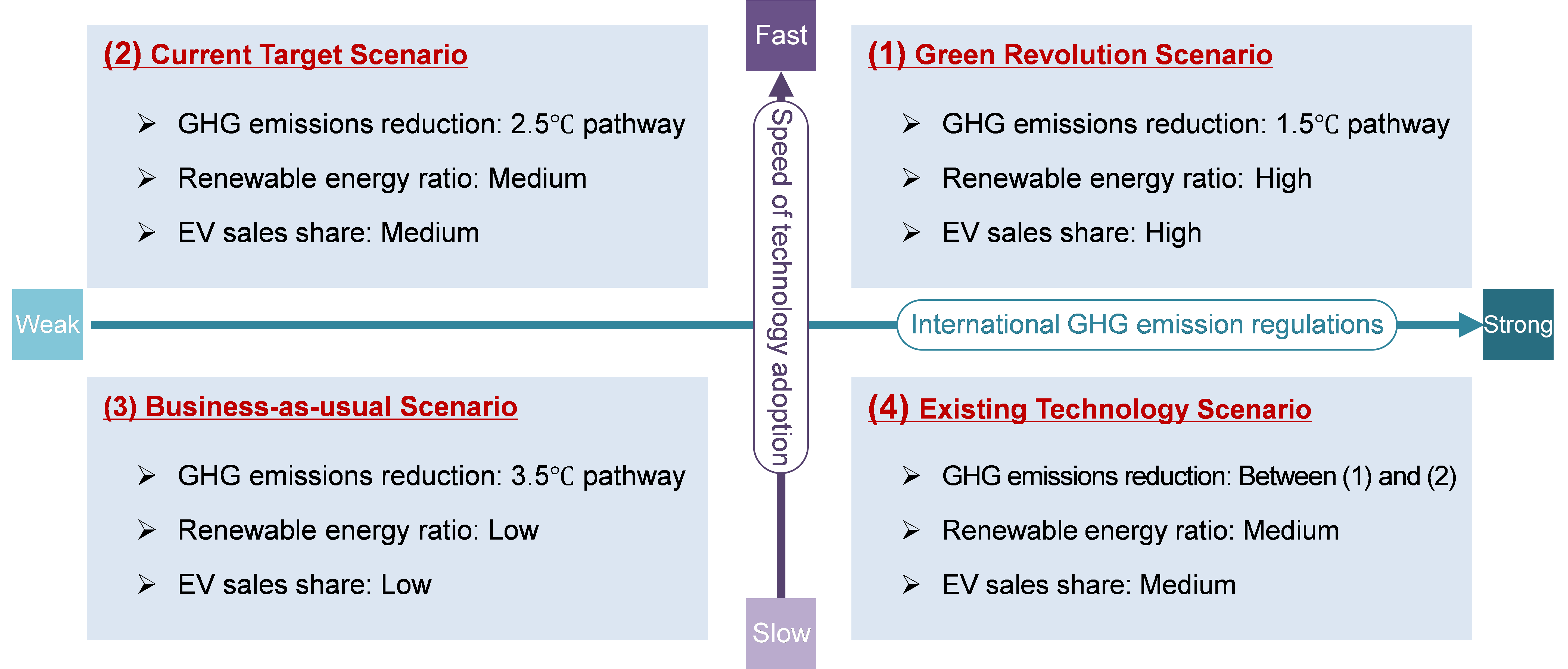 As for scenario planning, factors that determine future scenarios are identified and then normally narrowed down to two. In this study, one factor of the two is identified as “international greenhouse-gas-emissions regulations” and the other as “speed of technology adoption.”