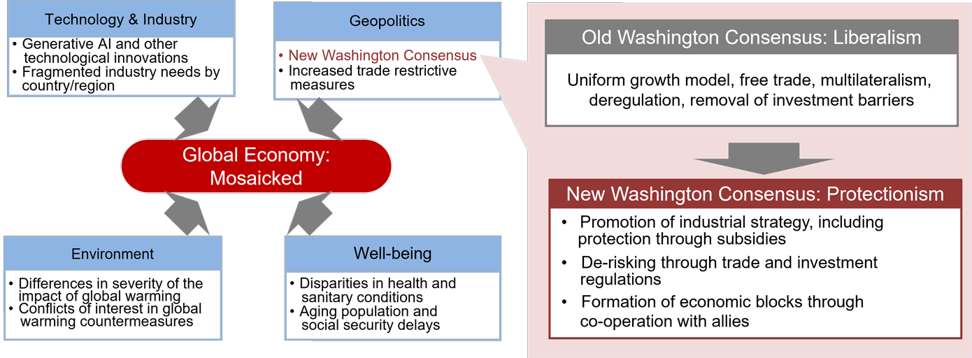 The global economy is now being fragmented due to several driving factors. In technology and industry, there are signs of market decentralization through technological innovations such as Generative AI, as well as immediate responses to the fragmented industrial needs of each country and region. In environment, differences among countries and regions are becoming apparent in terms of policy response countermeasures to global warming. In well-being, we can see disparity in social demand at different stages of economic development, and finally in geopolitics, in addition to de-risking from the U.S.-China hegemony race, the global rise of the New Washington Consensus has led to the development of a mosaic of fragmented markets. Consequently, the global market has become a mosaic (Figure 1).