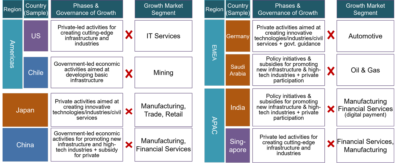 In the Americas region, we find that IT services are the growth market in the U.S., that have expanded through private sector led activities for creating cutting-edge infrastructure and industries. Whereas in Chile, mining is the growth market which is supported by the government-led economic activities aimed at developing basic infrastructure. In APAC region, in case of India, IT services (e.g. digital payments) and manufacturing have emerged as growth segments, driven by government policy initiatives and subsidies to promote new infrastructure and high-tech industries, encouraging greater private participation. Whereas in Singapore, private sector led activities for cutting-edge infrastructure and industries lead to growth of financial services and manufacturing.