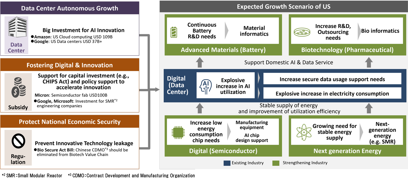 In such transforming and private sector autonomy countries, it will be important to have business strategies that consider the core industries of growth, such as data centers in the U.S., and the ripple effect of digital, green, and biotechnology on peripheral industries, while keeping an eye on policy implications.