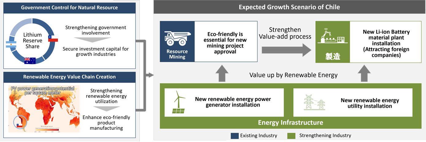 The Chilean government is strengthening the governance for natural resources by state-owned companies to secure investment capital for new growth industries through the export of abundant resources. In addition, the government is promoting the introduction of renewable energy as a national policy and is planning projects to enhance solar and wind power generation, as well as expand High Voltage Direct Current (HVDC) and hydrogen plants in the future. These government activities will serve as a foundation to support the strengthening of mining and manufacturing industries. Previously, Chile only supplied raw materials such as lithium, but now it is actively promoting to attract foreign investment to strengthen exports of high-value-added products through resource processing, such as cathode materials for lithium-ion batteries.
