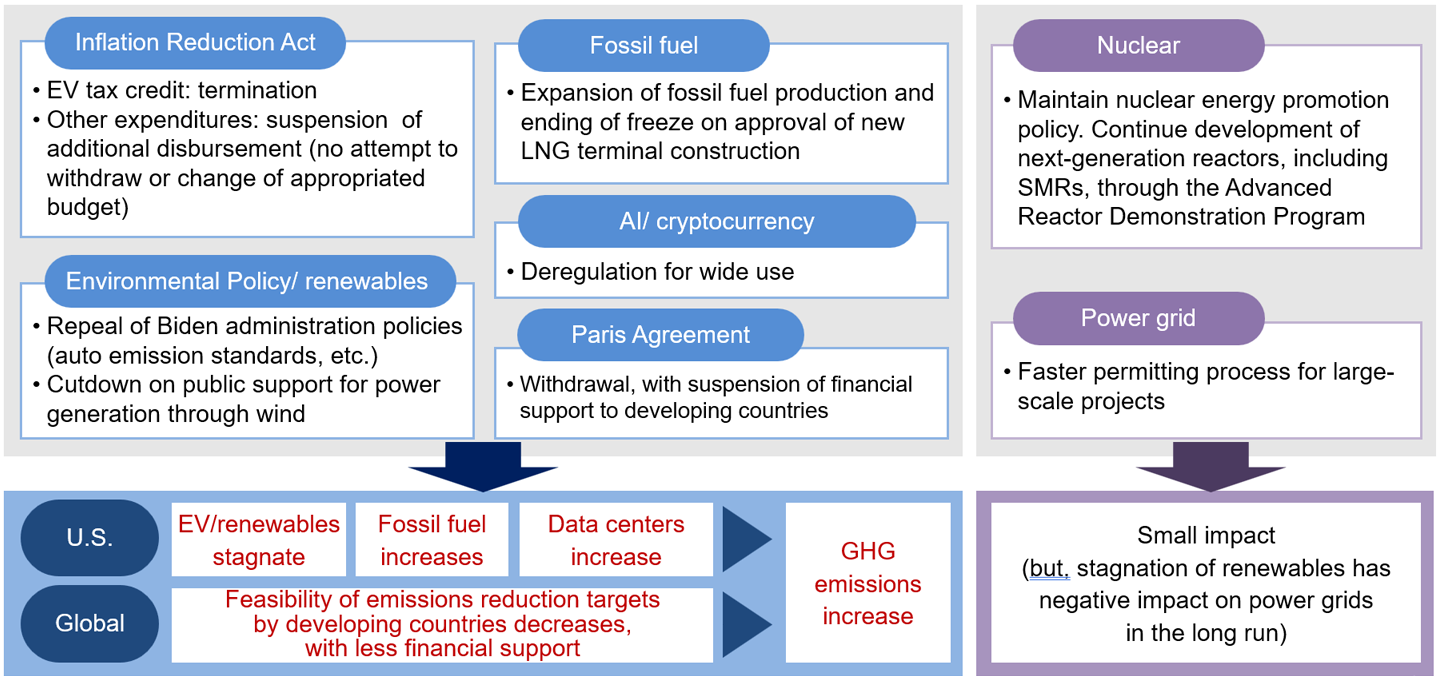 President Trump had promised to review the domestic decarbonization policies and withdraw from the Paris Agreement, and signed the executive orders on these issues on the day of inauguration (Figure 3). Firstly, the review of the decarbonization policies will work in the direction of increasing greenhouse gas emissions in the United States, making it uncertain whether the United States will achieve its 2030 target of reducing greenhouse gas emissions by 50 to 52% (compared to 2005 levels). If the emissions from the second-largest emitter in the world, the United States, start to increase, it will exert upward pressure on global emissions as a whole. Secondly, the amount of financial support from the United States to developing countries will decrease significantly, which will reduce the feasibility of achieving the targets for many developing countries that have set their emission reduction goals based on the assumption of financial support.