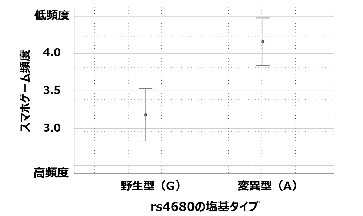 スマホゲーム頻度が高いことは、前に述べた通り、脳トレーニングの効果としては良いアウトカムを、ゲーム依存になってしまうような場合は望ましくないアウトカムをもたらすことになる。これら、良いアウトカムを促進し、悪いアウトカムを抑制するためには、当事者の遺伝子タイプとその目的に応じて、その人の環境への介入を考慮すべきであろう。例えば、良いアウトカムをもたらす目的のためにスマホゲーム頻度を向上させるには、rs4680が変異型(A)の当事者に対して刺激の少ないゲームを提供するなどの施策が望ましい。悪いアウトカムを抑える目的のためにスマホゲーム頻度を下げるには、野生型(G)の当事者に対し、ゲームとは異なる刺激を与えるような対応を検討することが効果的かもしれない。このように、さまざまな可能性を検討していくことが求められる。
