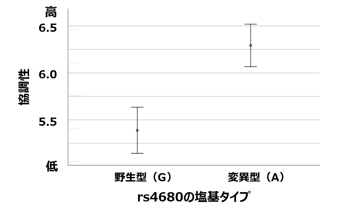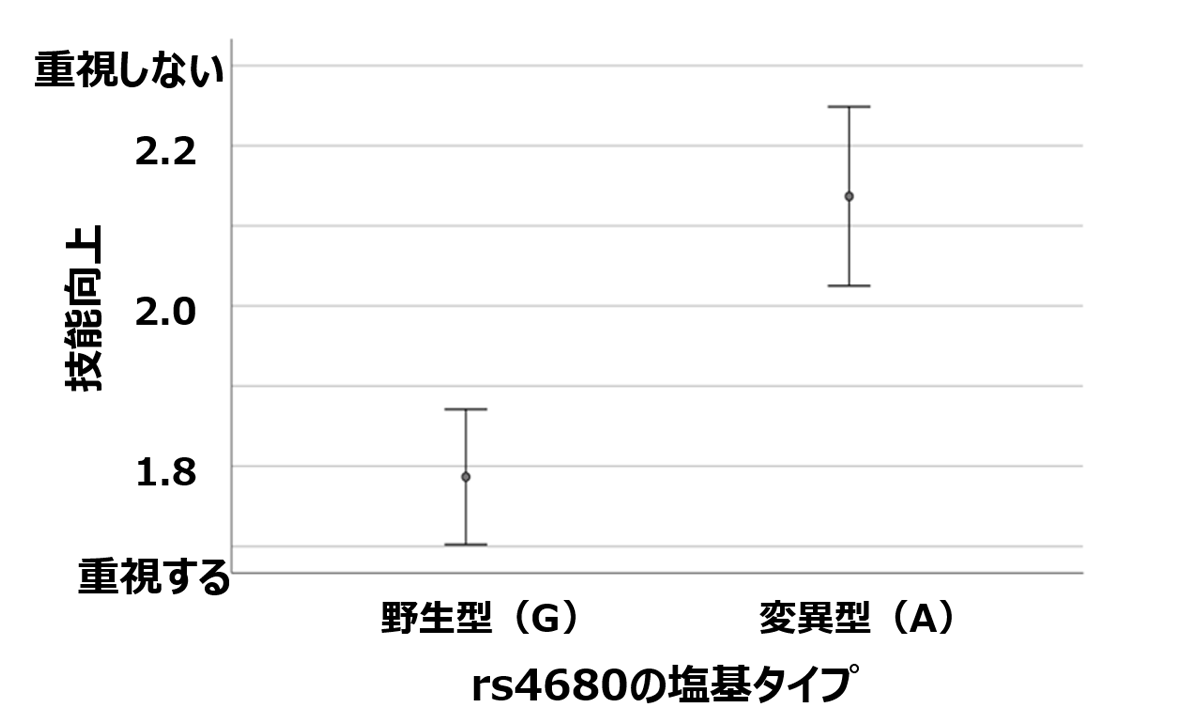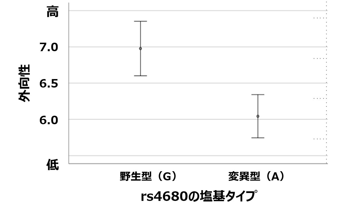 以上の結果より、野生型(G)の遺伝子を持つ人は、「スマホゲームを長時間、頻度高く行う」傾向にあり、「外向性が高く(活発)」、「協調性が低く」、「技能向上や新技術習得のための訓練の機会が多いことを重視する」ということが示された。野生型、warriorの人は、ドーパミンがすぐに分解されてしまうため、ドーパミンを得るために多くの刺激を求める。そのため、一度スマホゲームで刺激を受けると、その刺激を継続的に得ようとして長時間ゲームを行う。同様に、多くの刺激を得るために外界に対しても活発になり、また自分を抑えて周囲に合わせる必要がある協調という観点は苦手になる。仕事においても、新技術習得という刺激を求めることが多い。一方で、変異型(A)の遺伝子を持つworrierの人は、刺激に過敏に反応してしまうため刺激が少ないことを好む。スマホゲームのような刺激は疲れを感じることが多く、刺激の多い外向けの活動も苦手である。刺激を恐れて自分を抑えるため、結果として協調性が高くなり、仕事においてはあまり変化を望まない。