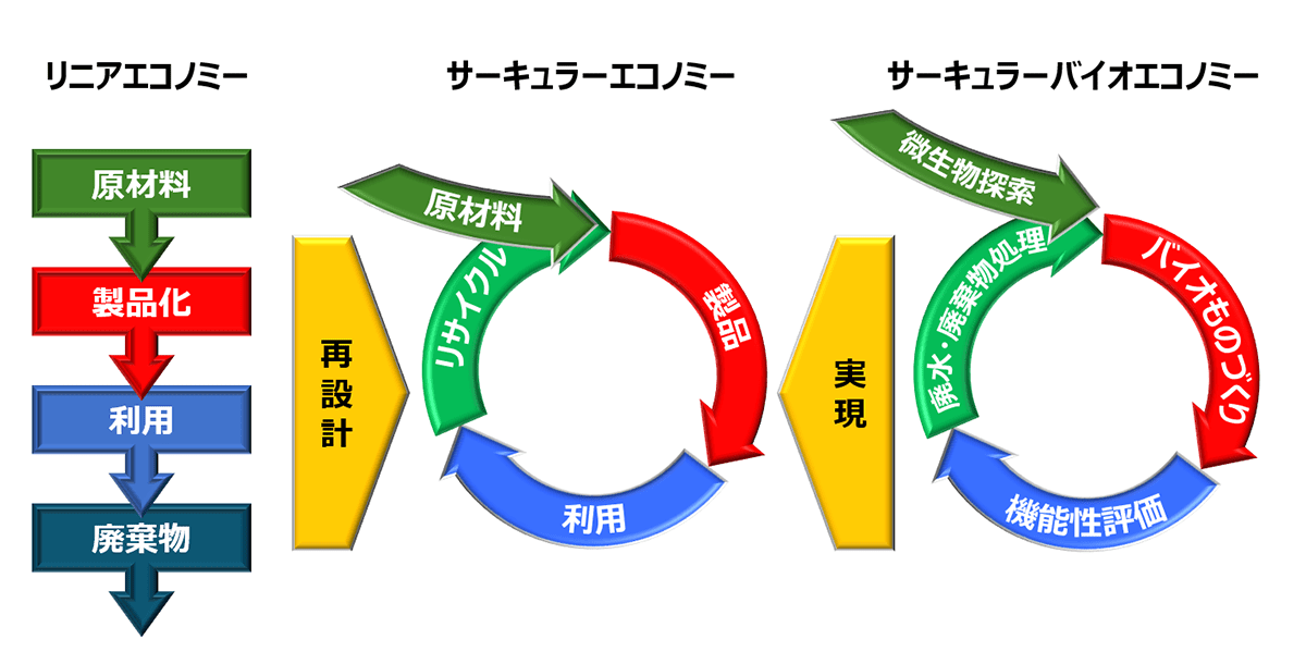 EUでは2012年に当時はまだその加盟国だった英国を中心としてバイオエコノミー戦略を策定し、2018年に改訂、さらに2023年には「欧州再生可能エネルギー指令」を改訂することで、バイオエコノミーとサーキュラーエコノミーを統合した循環型バイオエコノミー(サーキュラーバイオエコノミー)構築をめざしている。サーキュラーエコノミーで製品に当たる部分が、サーキュラーバイオエコノミーではバイオものづくりに相当する(図1)。