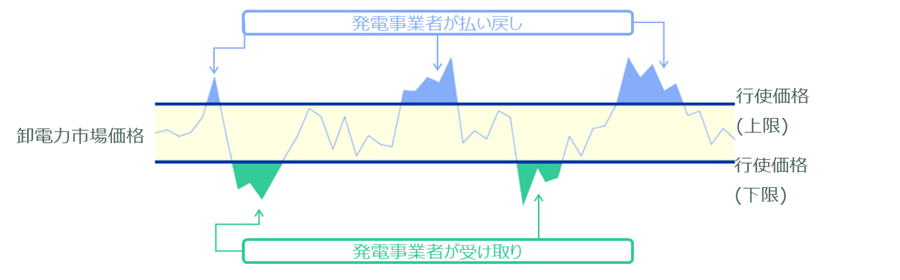 例えば、企業と発電事業者の間で結ばれる長期電力売買契約(PPA)の促進に向けて、欧州投資銀行による総額5億ユーロ規模の再保証の提供が予定されている。また、原子力や風力、太陽光事業者などの支援策として加盟国に採用が認められる「差額決済契約(CfD)」について、その設計に関するガイダンスを欧州委員会が策定することも提案されている。CfDは発電事業者と公的主体(国など)の間で結ばれる契約で、競争入札などを通じてあらかじめ「行使価格」が設定され、発電事業者は市場で電力を販売する一方、行使価格と売電価格(市場価格)の差分が公的主体との間で決済される(図1)。これらはいずれも、短期的な卸電力価格のボラティリティによる影響を軽減し、電力消費者が長期的に安定した価格で電力を購入できるようにする上で、重要な制度とみなされている。