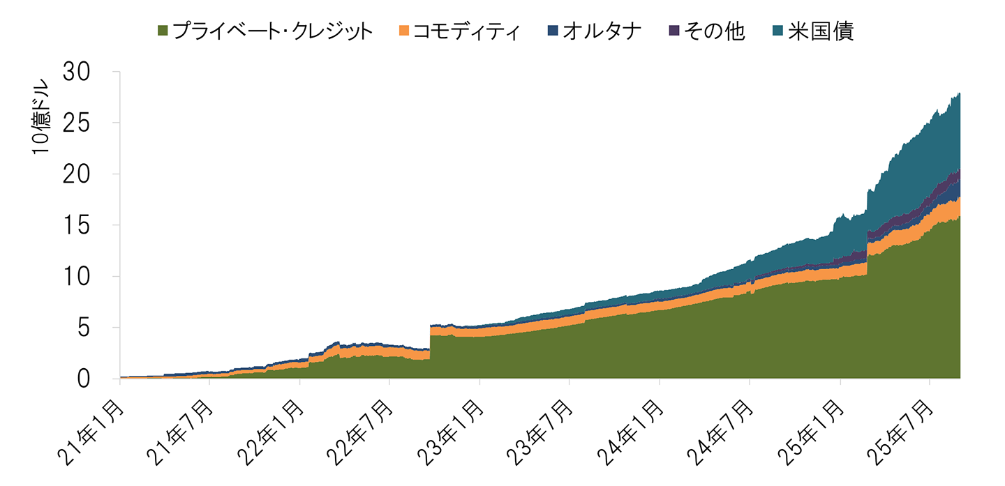 ステーブルコインの先にある動きとして注目されるのは、ブロックチェーンによるさまざまな資産のトークン化*7である。これらはリアル・ワールド・アセット(RWA)のトークン化と呼ばれ、世界ではおよそ300億ドル(約4.4兆円)の残高が確認されている(図表4)。日本でも、不動産のトークン化商品が新興のデジタル資産取引市場であるSTART市場で少額ながら日々売買されているし、今年9月には、ゆうちょ銀行やSBI新生が相次いでトークン化預金を発表した。