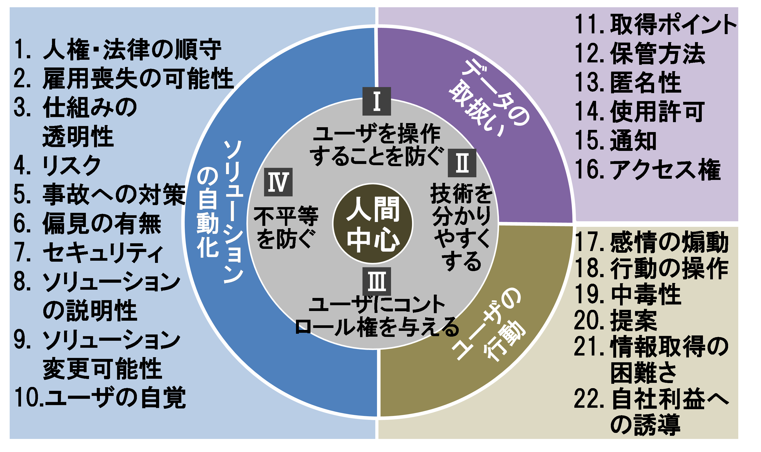 デンマーク政府の外郭団体である国立Danish Design Centerは、この問題に対処する一環として「デジタル倫理コンパス」を策定している。(図9)このコンパスは、デジタルサービス提供時の倫理的なポイントを明確にし、ユーザーの不利益を回避するための具体的なガイドラインを提供する。この倫理コンパスには、4個の基本原則と22の具体的な質問が含まれており、デジタルサービスの開発者や運営者が倫理的な観点からの判断を行えるよう支援している。