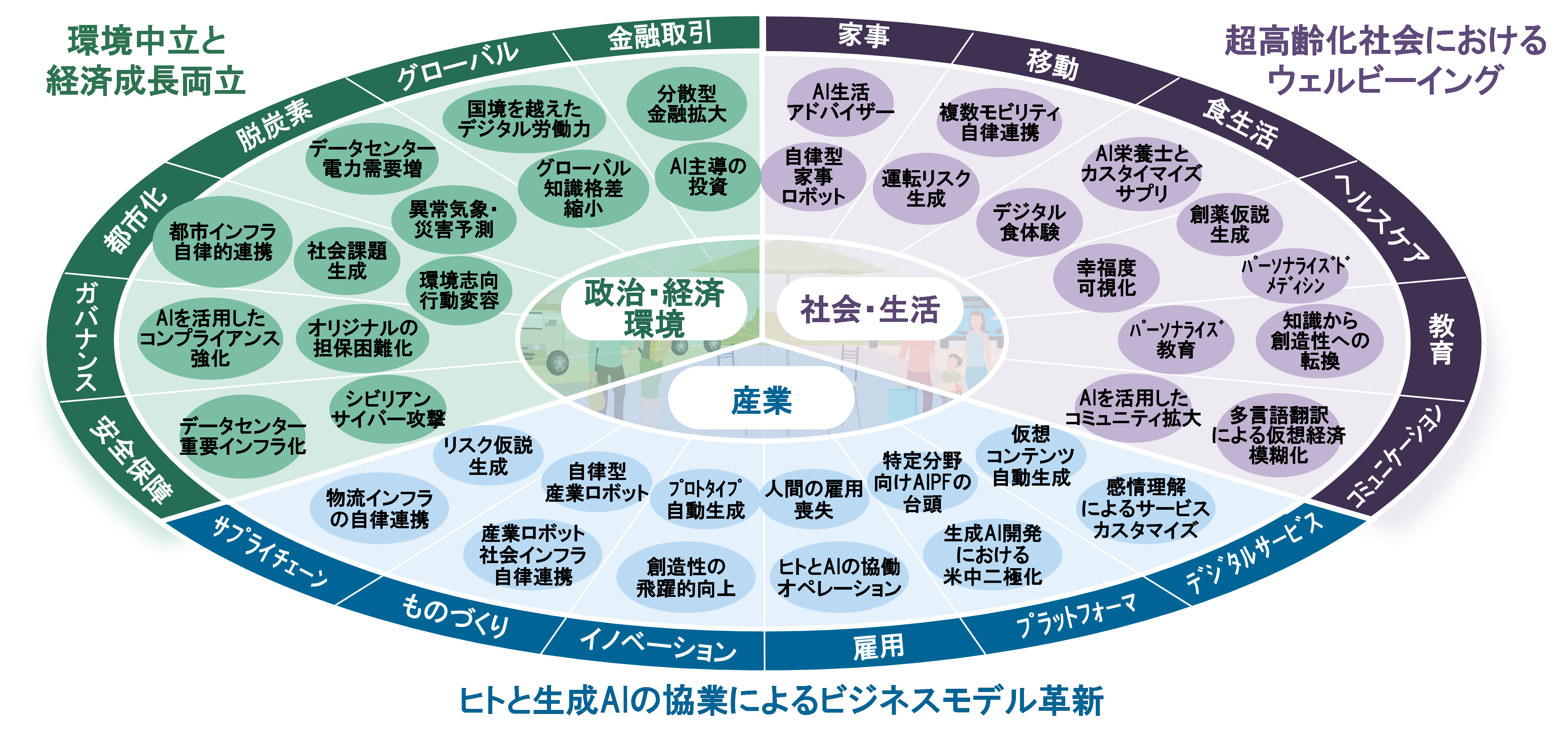 本論文では、環境中立と経済成長の両立(1.1)、超高齢化社会におけるウェルビーイング(1.2)、ヒトとAIの協業によるビジネス革新(1.3)という三つの将来シナリオを描いてみたい。