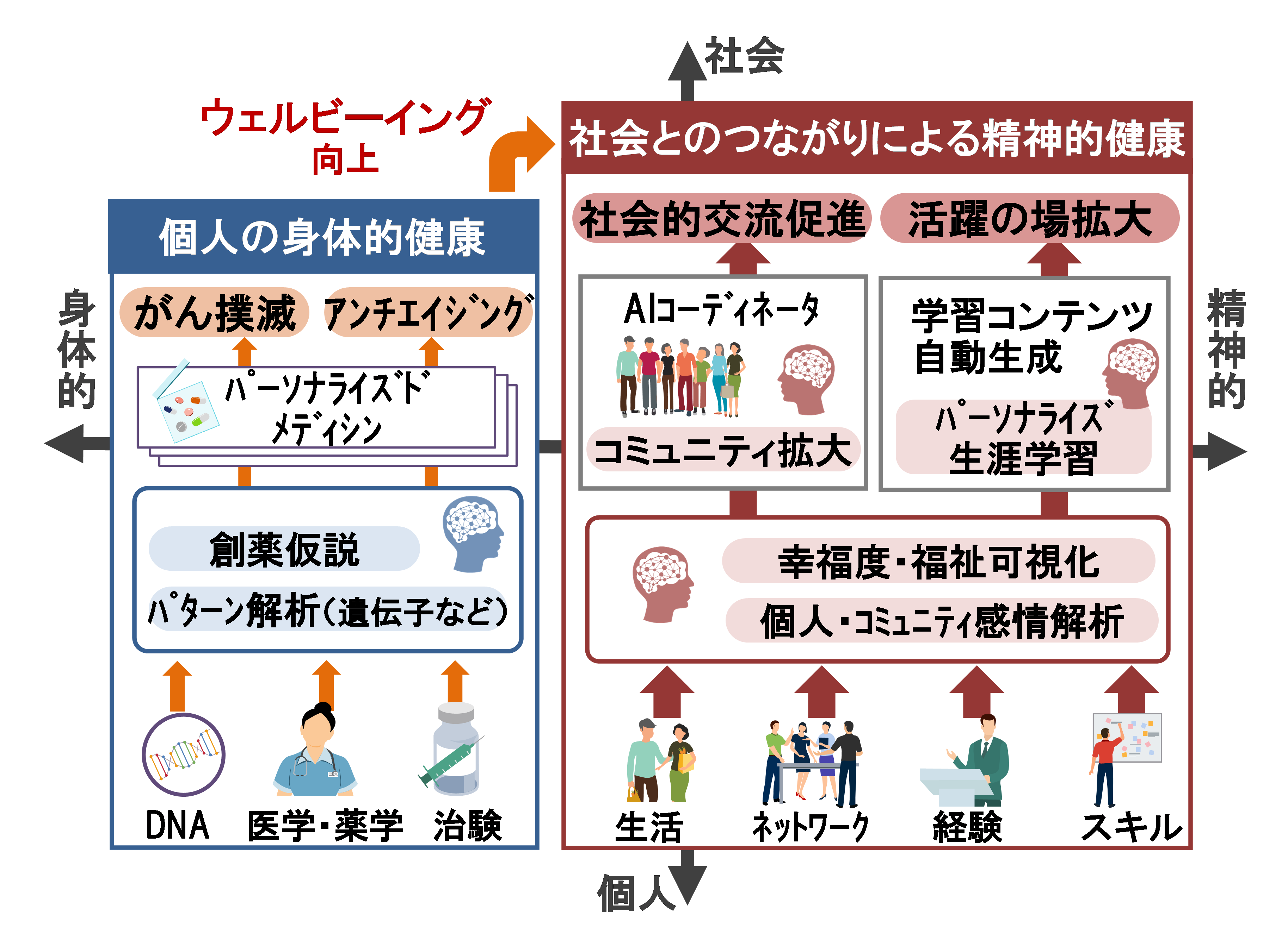 2030年には、生成AIが遺伝情報などの複雑なデータを解析し、生命科学が大きく発展することで、個別化された創薬が行われ、その効果により長寿命化が実現する。この長寿命化は、ウェルビーイングの焦点が肉体的な健康から精神的な健康へと移行する要因となる。