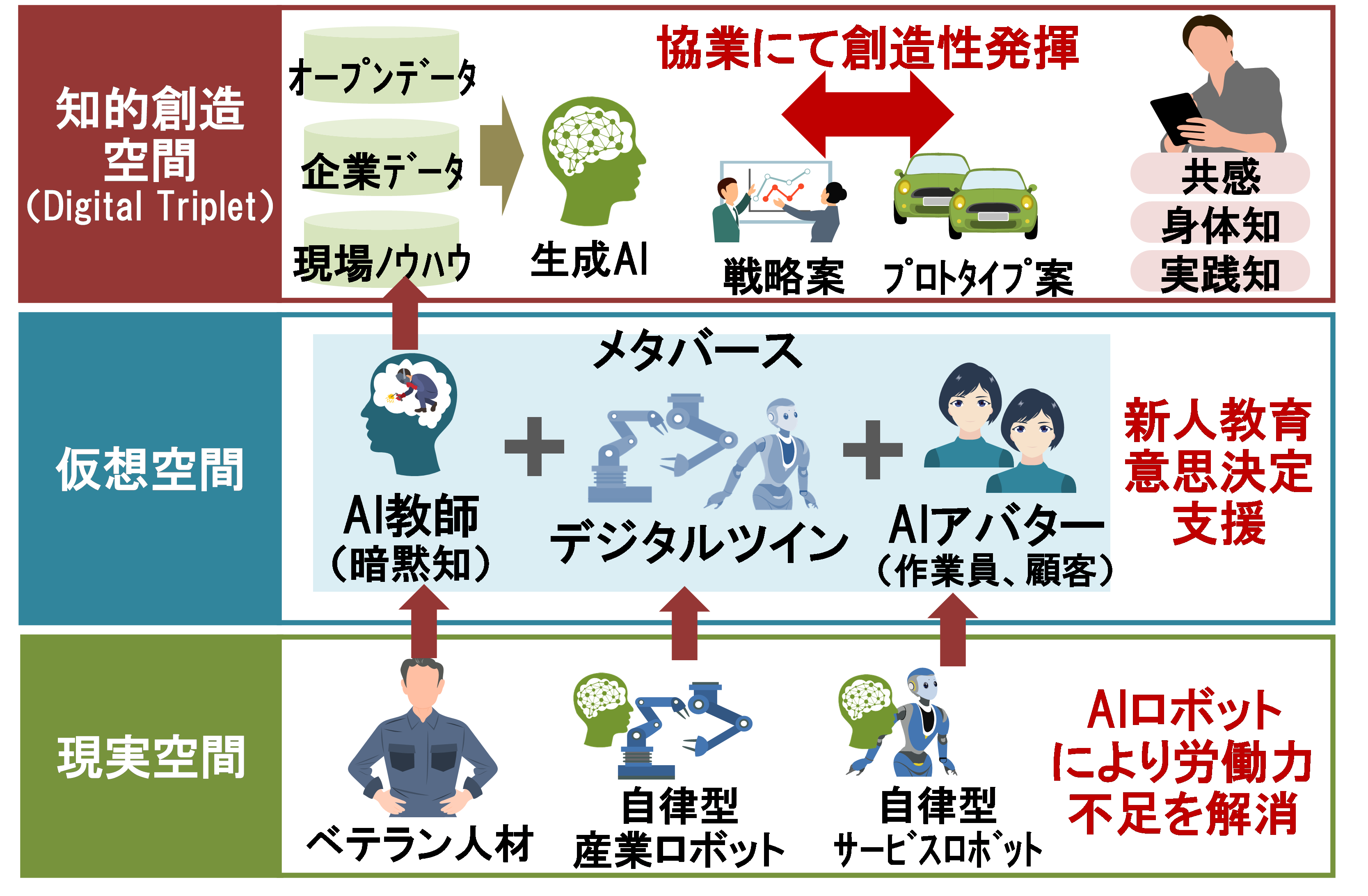 2030年代には、先進国だけでなく新興国においても労働力不足が深刻化すると予想される。この問題に対処するために、現実空間(生産現場)、仮想空間(現場管理・監督)、知的創造空間の三つの領域それぞれで、生成AIが活用される。