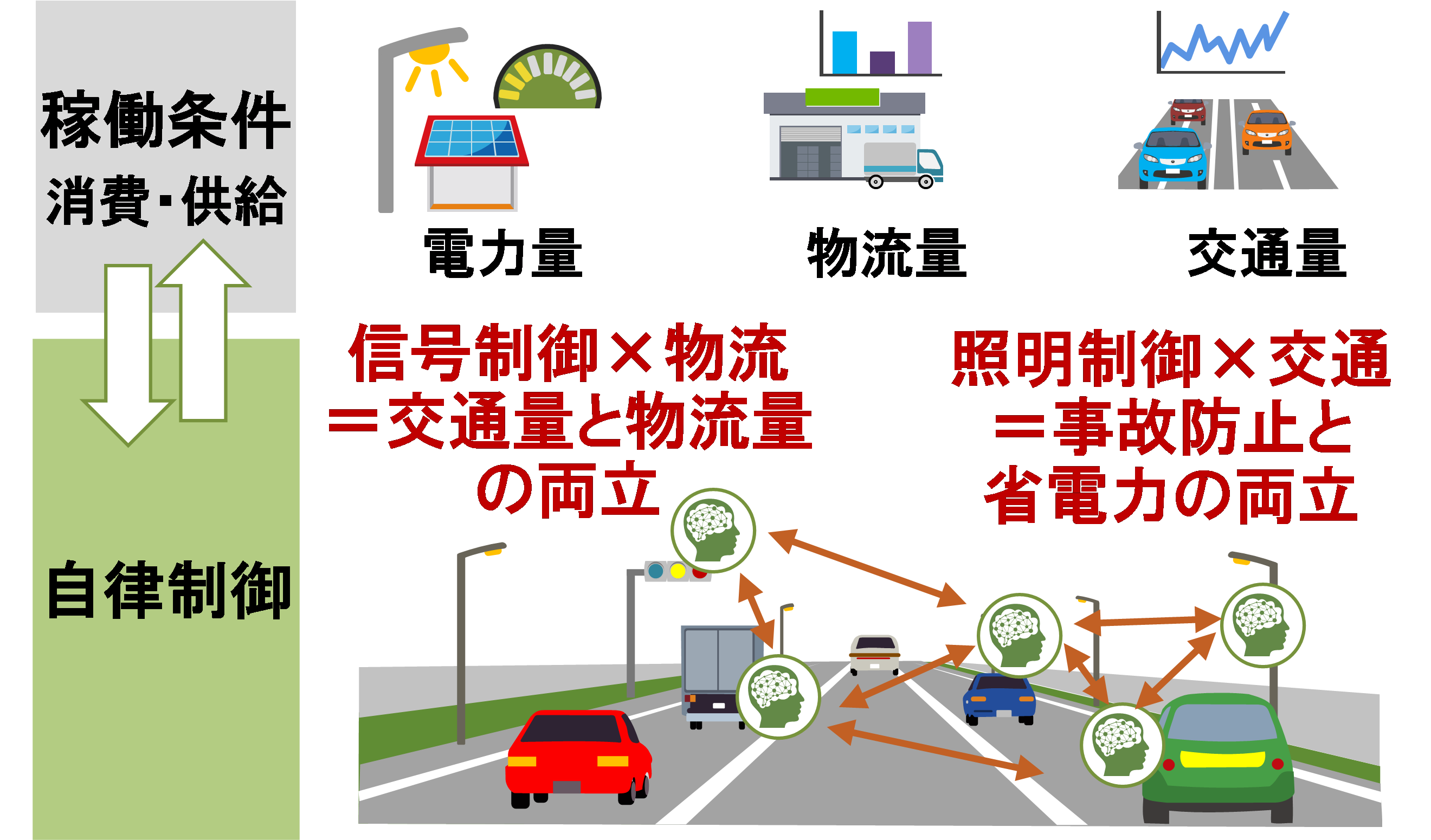 SSMの応用により、社会インフラの運営がよりダイナミックになる未来が予想される。具体的には、信号機とトラックが交通量と物流量を調整するために対話することで、物流の効率化・最適化が可能となる。また、街灯と自動車が互いにコミュニケーションを取りながら、事故防止とエネルギー消費の削減を同時に達成する。そこでは、電力量、物流量、交通量などの稼働条件がリアルタイムで分析され、環境に適応する形でインフラが自動的に調整される。(図5)