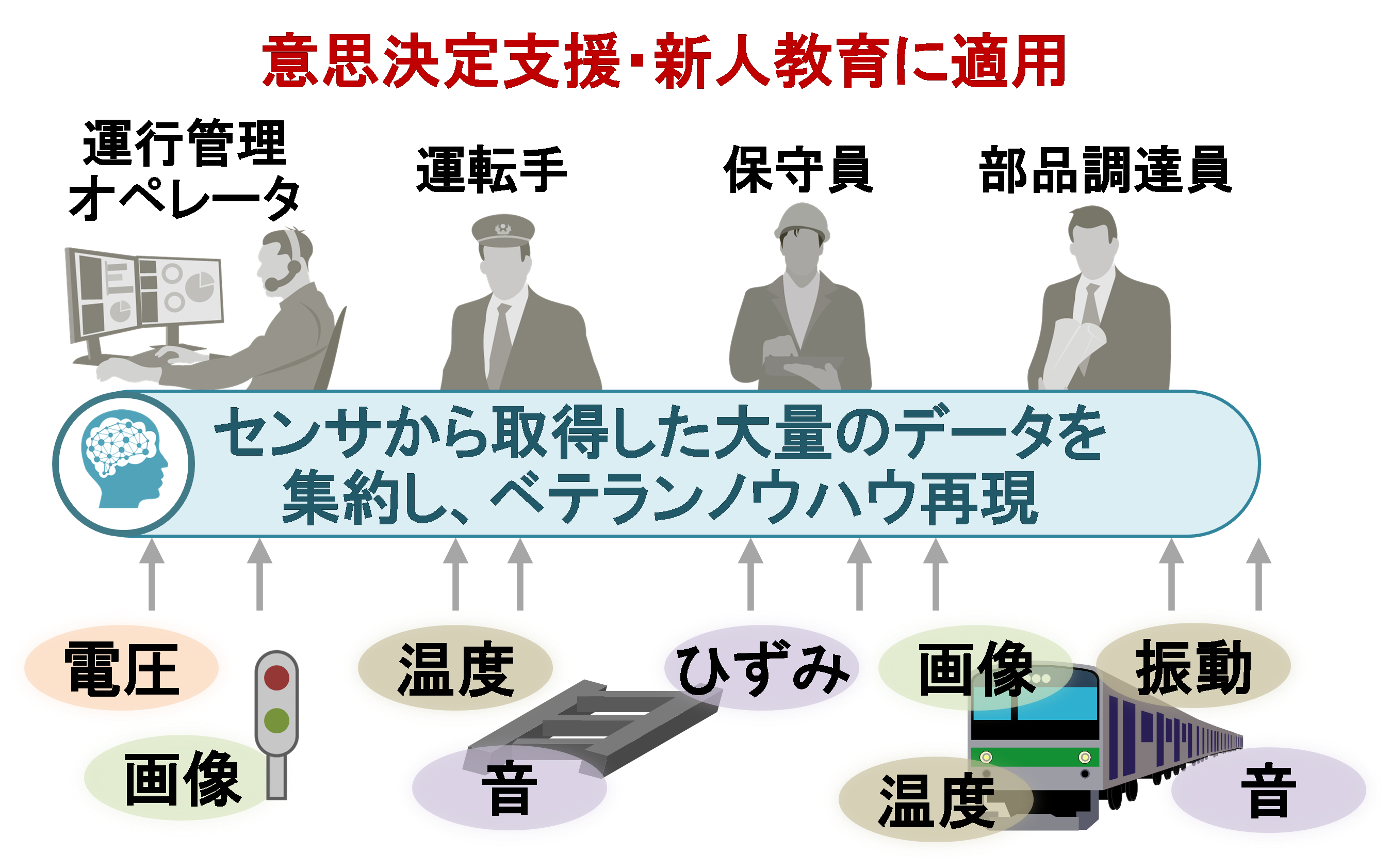 このマルチモーダルモデルの広範な応用により、将来的にはヒトとAIの協業の一層の進化が期待される。例えば、鉄道分野では、信号機、線路、車両から得られる画像や音声データに加え、電圧や温度、振動などのセンサーデータをマルチモーダルモデルが統合する。これにより運行管理、運転、保守、部品調達などの業務でベテランのノウハウを再現し、意思決定の支援や新人教育に活用することが可能となる。(図7)このように、ArchetypeAI社の技術は、業務効率の向上だけでなく、業界全体の生産性向上に貢献していくことが期待される。