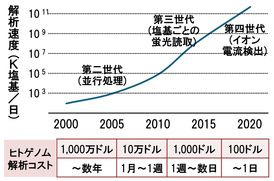それからの6年、バイオ技術そのものの進展に加え、新たなデジタル技術の革新や社会的な要請により、バイオ技術は研究から実用化、さらに社会実装へと発展しつつある。例えばバイオ計測技術においては、DNAを構成する塩基配列を解析するシーケンサの性能は継続的に向上しており、従来の蛍光を用いた計測から電流による計測技術へと発展し、長い塩基配列を高速に読み取ることができるようになった。その結果、ヒトゲノムを1日、100ドルで、安価・高速に解析可能となっている(図1)。また、デジタル技術においても、AIにおける深層学習や生成AIなどの技術革新により応用範囲が拡大し、バイオ分野への適用が進んだ。具体的には、アミノ酸配列やタンパク質構造などの生化学データおよび学術論文を機械学習して生化学言語としてLLM(Large Language Model)が構築されている。生化学に特化したLLMを用いた生成AIは、ゲノム情報を言語として読み取り、ゲノムに含まれる遺伝子の意味や機能を解釈することで、研究者が利用可能なレベルに達してきた(図2)。社会的な要請もまたバイオ技術の社会実装を後押ししている。2019年に発生したCOVID-19パンデミックでは、ワクチンが至急、大量に必要とされるという社会的な要請に応じてmRNA*3(messenger RNA)ワクチンが緊急開発され、2020年末に接種が開始された。通常は米国でも数年以上かかるワクチンの承認が、コロナ禍における強い要請により1年以内の速さで認められた。このように現在、バイオ技術がヘルスケア分野を中心に、デジタル×バイオによるトランスフォーメーションを起こしており、今後さまざまな産業分野においてグローバル課題解決に向けたBXの拡大が期待される。