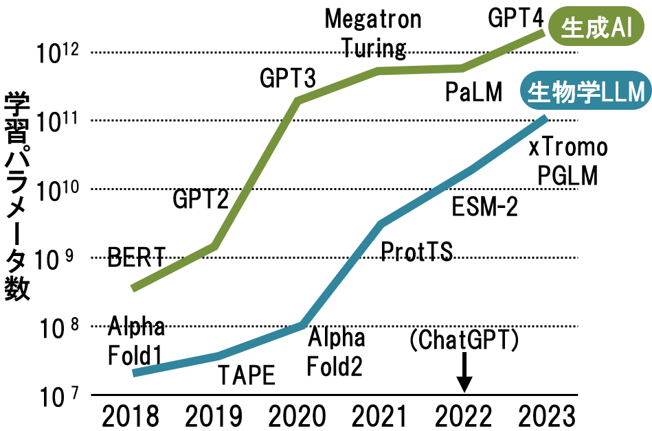 図2 LLM学習パラメータ数の推移(生成AIとの比較)