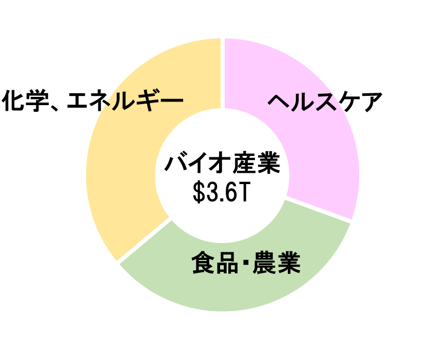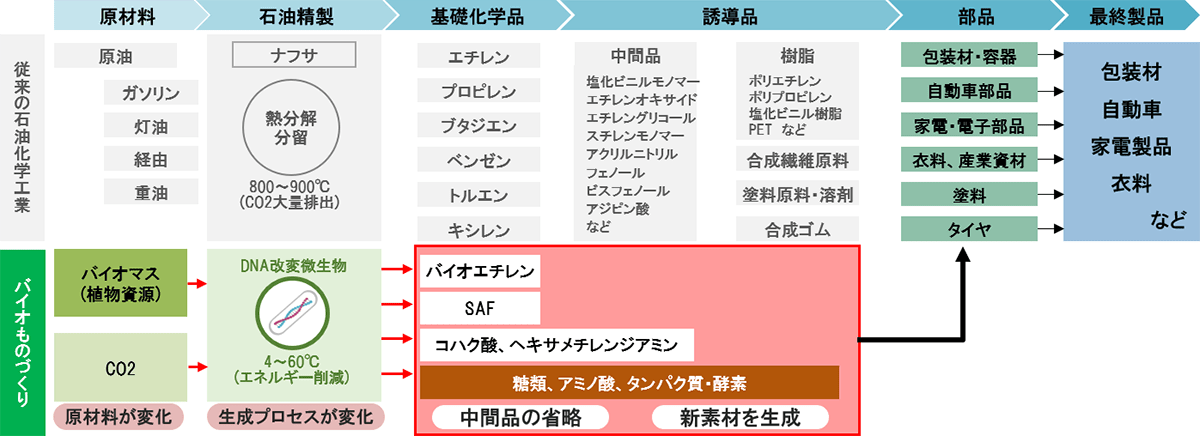 このようなバイオものづくりは、医薬ヘルスケア分野で実用が先行しているが、他の産業分野においても社会実装が広がりを見せている。昨今の石油化学工業の分野では、資源国や新興国が基礎化学品の生産領域にまで参入しつつあるため、非資源国の石油化学工業は原材料である石油の購入コストおよび輸送コストという観点で競争力を失いつつある。また、鉄鋼業界では、主に製鉄プロセスにおいて大量のCO2を排出しており、環境対応の観点でCO2削減を模索している。このような背景を踏まえ、化学や鉄鋼などの製造分野で、バイオ技術の導入が始まっている。