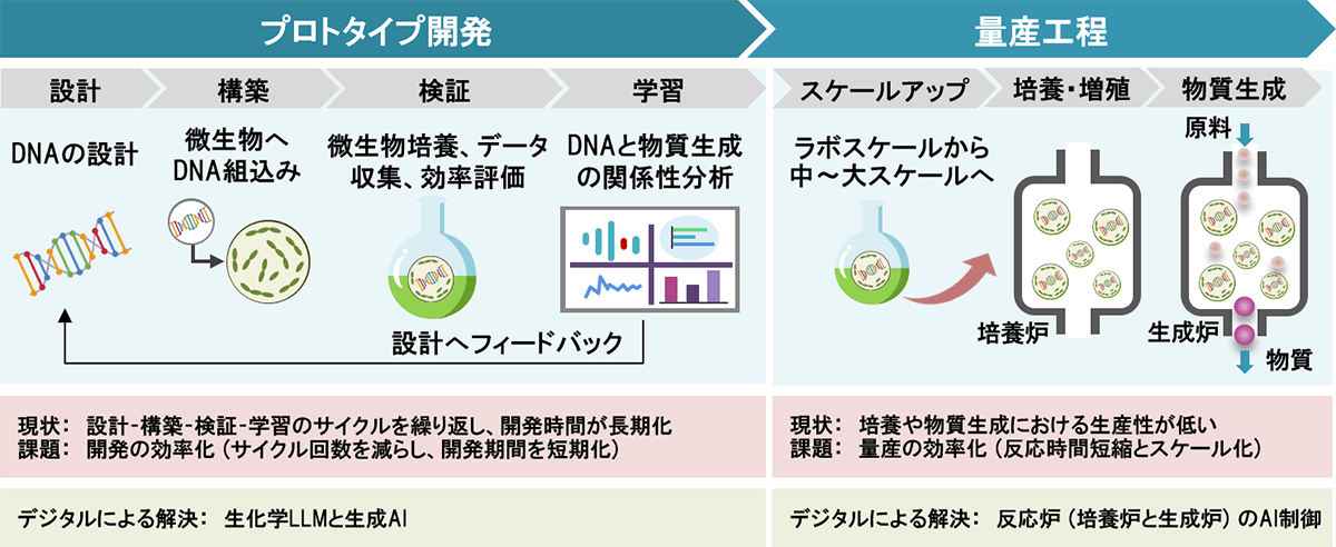 量産工程では、微生物を培養して増殖し、その増えた微生物を用いて目的とする有用物質を大量に生成する。培養の過程で期待していなかった微生物が発生したり、微生物による物質生成の過程で有害物質を産出したりするなど、予期しない不具合により微生物が減少し、生産効率が劣化してしまうことが課題となっている。対策として、デジタル技術を用いて微生物反応炉(培養・増殖もしくは生成・生産するための容器)の環境条件を最適に制御するための取り組みが進められている。具体的には、増殖の進み具合や物質の生成量に応じて最適値が刻々と変化する環境条件(反応炉における温度、圧力、酸素濃度、pH値、撹拌(かくはん)速度、原材料投入・生成物排出速度など)を、各種センサを用いてリアルタイムに計測し、AIを活用してその時の状態に適した環境制御を行うことで、量産工程における生産性と品質を高める方法である。