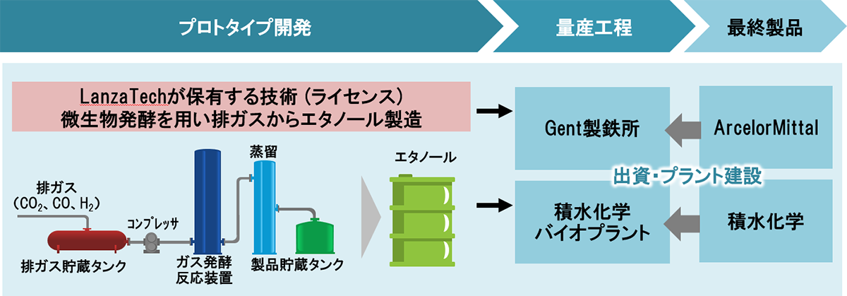 LanzaTechは、DNA改変した微生物によりCO2からバイオエタノールを生産する技術を持ち、この技術を製造企業にライセンスすることでバイオの社会実装を進めている(図7)。化学メーカである積水化学は、LanzaTechからライセンスを得てバイオプラントを稼働している。また、鉄鋼メーカであるArcelor Mittalは、製鉄工場内で排ガスとなっているCO2を回収し、LanzaTechの技術を活用してバイオエタノールを生産するプラントを稼働している。このように、製造分野でもバイオへの取り組みが本格化している。