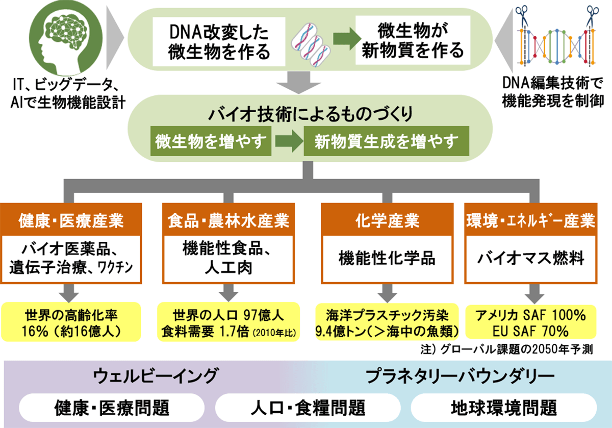 バイオ分野においてAI(Artificial Intelligence)などのデジタル活用が進み、バイオ技術は基礎研究から社会実装へ進展しつつある。バイオ医薬や遺伝子治療などの医療革新とそれを通したウェルビーイングへの貢献、微生物の産業利用によるプラネタリーバウンダリーへの対応やサーキュラーエコノミーの実現など、グローバルな課題解決に向けた進化が期待される。
