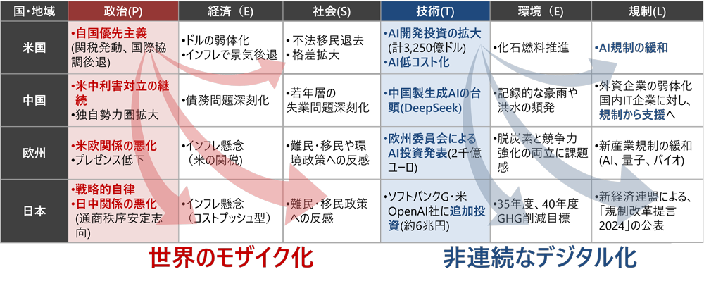二つ目は「非連続なデジタル化」である。AI開発投資は米国で3,250億ドルに達し*1、生成AIの高性能化と低価格化が急速に進展している。また中国では「DeepSeek」などの国産生成AIの台頭、欧州では2,000億ユーロ規模のAI投資*2、日本ではソフトバンクグループからOpenAI社への最大6兆円の追加投資が見込まれている。AI中心の技術革新に向けたこれら大規模投資は、社会の根幹を揺るがす非連続な変化をもたらすと予想される。