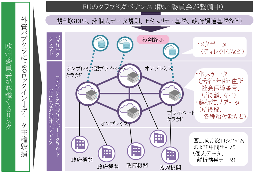 EUの行政機関である欧州委員会は、2019年5月にガバメントクラウド戦略「European Commission Cloud Strategy」を採択した。同戦略は、EU加盟国の政府情報システムのクラウド化を促すものであるが、同時に具体的なシステム形態として、ハイブリッドクラウドに、複数のサービスベンダの「マルチ」利用の考えを付加した「セキュリティ性の高いマルチ・ハイブリッドクラウド*2」を原則としている。この原則の背景には、特にEU域外企業*3が提供するパブリッククラウドサービスの利用に対する複数の当局の懸念がある。それは、①クラウドサービス企業の本国政府による、EU域内データへの強制アクセス*4、②個人情報(氏名、生年月日、住所、社会保障番号、所得・納税額など)の漏洩・改ざん、③クラウドサービス契約解除後のデータ回収に掛かる時間・コスト、である。欧州委員会は、これをEUのデータ主権の毀損(きそん)として警戒している。そこで欧州委員会が推進するのが、分散・連携によるクラウドサービス利用である(図1)。その仕組みは、EU加盟各国の政府機関にて、EU企業が提供するクラウドサービスを念頭に比較的小規模なプライベートクラウドとオンプレスを複数併用し、それぞれのシステム内で個人データを「分散」保存し、その上で所得税額・各種給付額などの解析で必要な場合に、当該データをシステム間で「連携」するものである。また、政府機関の間でのデータ共有には十分なセキュリティ制御を実装する。