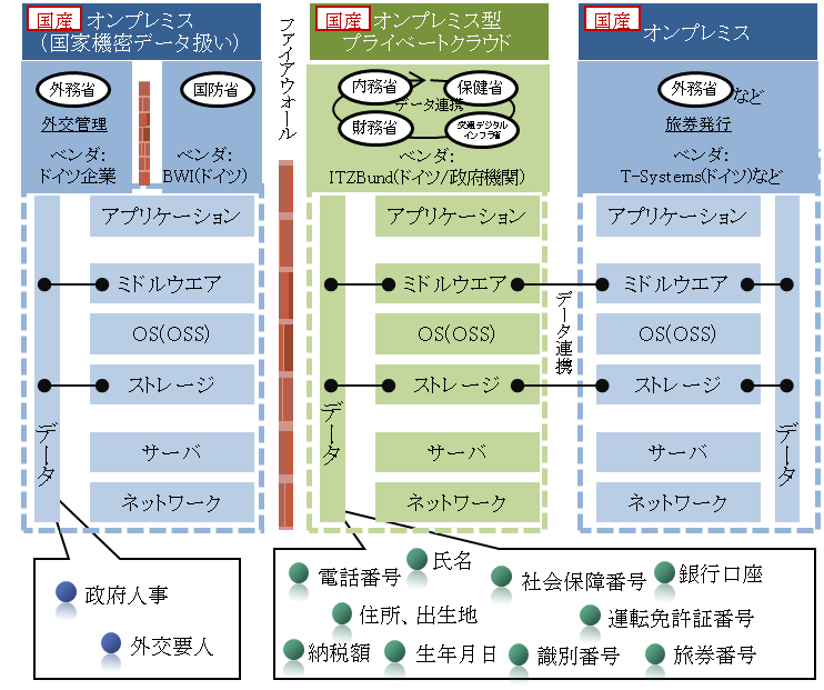 Bundescloudはプライベートクラウドであるが、データセンタが政府機関構内にある点でオンプレミスでもある。ドイツ連邦政府はBundescloudの情報システム形態を「オンプレミス型プライベートクラウド」と呼び、ネットワーク・ストレージの集約やOS・ミドルウエア・行政業務アプリケーションの共有などクラウドサービスの利点を追求するともに、オンプレスの特性を生かしてデータの保護も維持している。また、ドイツ連邦政府は、マルチ・ハイブリッドクラウドを構成する各情報システムの間でのデータ交換に当たり、厳重な制御を行っている。例えば、外務省が行政実務としてある個人に旅券を発行する際、内務省がBundescloud内に保存している個人の基礎情報(データ)にアクセスしコピー、外務省が利用するオンプレミスに移動させて処理するといった形である。このように個人情報など保護の必要性が高いデータを省庁間で共有する際、安全に授受を実行させるデータ制御の技術が重要となる。具体的には、データの暗号化、仮想サーバおよびデータへのアクセス権付与と期間設定、データアクセスの際の認証、複製・移動・消去ログの管理、などの技術である。ドイツ連邦政府はこれら技術の開発をドイツのミドルウエア開発企業に委託、その成果をBundescloudとオンプレミス(例:外務省が旅券発行業務で利用)の両者それぞれに実装している。また前述のように将来EU域外企業のクラウドサービス導入の際には、Bundescloudとの安全なデータ共有のため、このデータ制御ミドルウエアが当該クラウドにも実装*6されることが予想される。