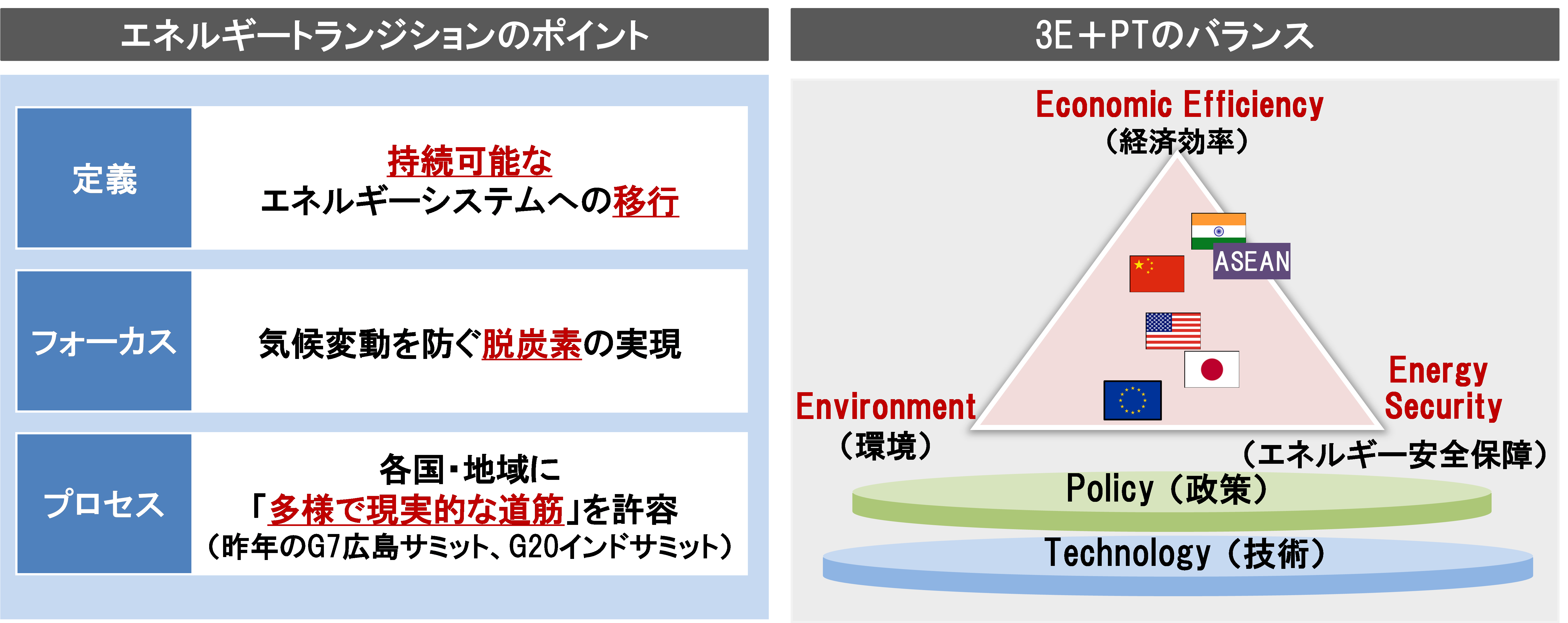 エネルギートランジションとは、持続可能なエネルギーシステムへの移行を指し、現在の主要なフォーカスは気候変動を防ぐための脱炭素化の実現である。その実現プロセスでは、各国・地域に「多様で現実的な道筋」を認めることが、昨年のG7広島サミットで確認されており、G20インドサミットにも引き継がれて、現在に至っている(図1)。