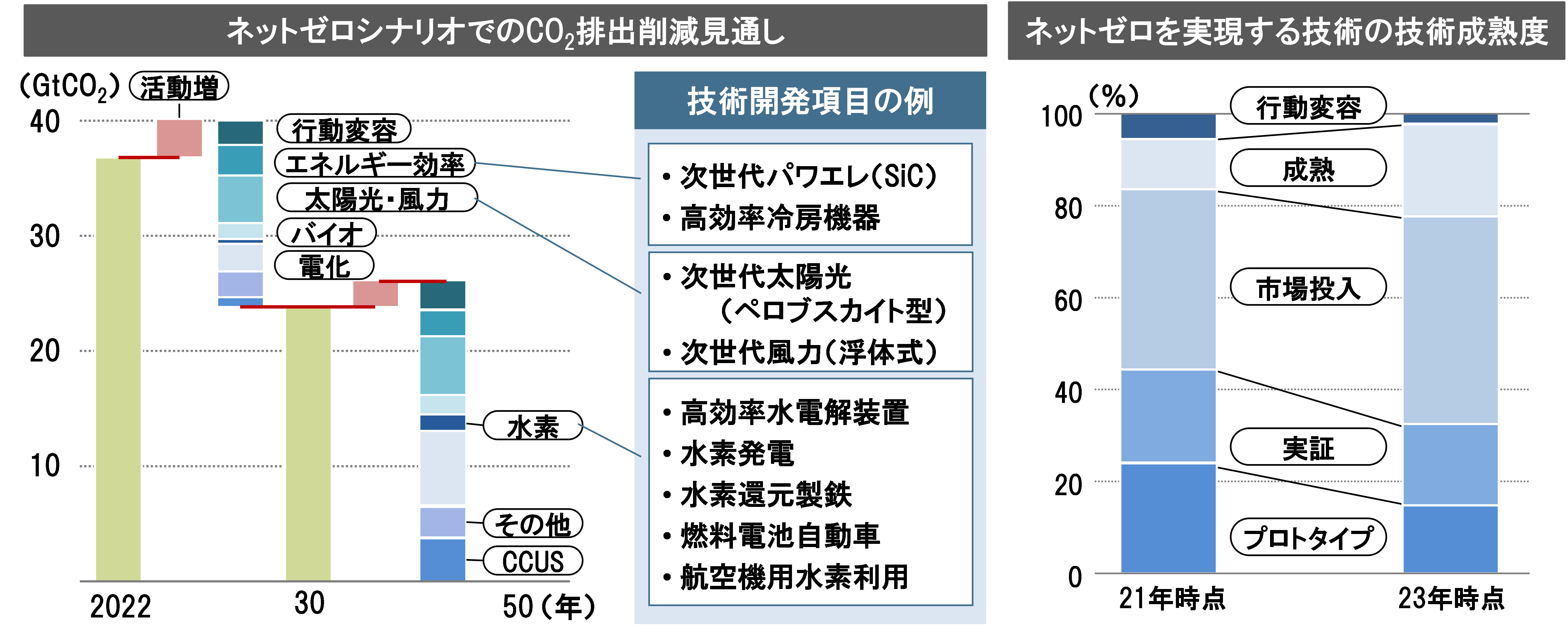 国際エネルギー機関は、ネットゼロを実現するための技術について、技術成熟度を分析している。これによると、2023年時点では、プロトタイプと実証の段階にある技術の割合が2021年時点より減少しているものの、依然として3割強であり、技術開発の動向は慎重に見ていく必要がある。