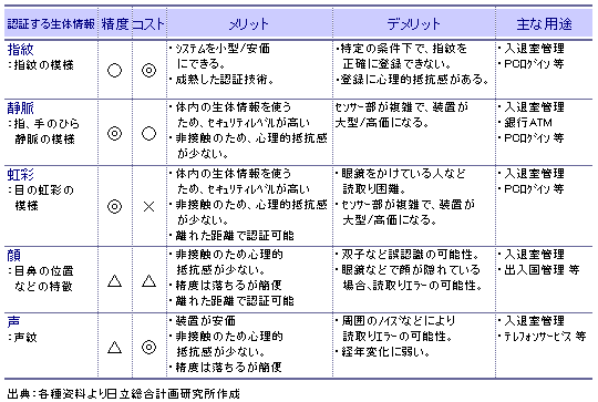表:主な生体認証のメリット・デメリット
