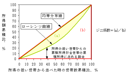ジニ係数とは、イタリアの統計学者コンラッド・ジニが1936年に考案した指数で、所得格差を表す代表的な指標です。横軸に世帯数の累積比、縦軸に所得額の累積比をとり、世帯を所得の低い順に並べた際に所得額の累積比が描くローレンツ曲線と均等分布線で囲まれた部分(a)の面積が、均等分布線より下の三角形(b)の面積に占める割合を指します(図1)。所得が完全に平等に分配されている時には(a)の面積が0となり、逆に一世帯が所得を独占している時には(a)と(b)が一致するため1となります。つまり、ジニ係数は0と1の間の値をとり、1に近いほど所得格差が大きいことを示します。