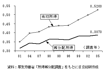 2007年8月に厚生労働省が公表した「平成17年所得再分配調査」によれば、日本のジニ係数は当初所得で0.5263と、上昇傾向をたどっています。一方、当初所得から税や社会保険料を引き、社会保障給付を加えた再分配所得は0.3873となっており、税や社会福祉などにより不平等度が緩和されていることが分かります。もっとも、再分配所得のジニ係数も、当初所得ベースと比べれば上昇ペースは緩やかながら上昇傾向にあり、所得の再分配が行われたベースでも所得格差は広がっています(図2)。