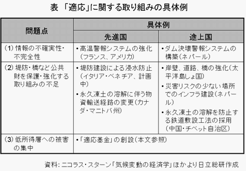 地球温暖化対策は、「緩和」策にとどまらず、既に進行している地球温暖化の被害を最小限に抑えるための「適応」策の推進が必須だと言えるでしょう。 元世界銀行チーフ・エコノミストのニコラス・スターン博士は、英国政府の依頼を受けてまとめた著名な報告書「気候変動の経済学(The Economics of Climate Change)」の中で、「適応」策の実施に際し、現行の市場経済システムが抱える限界として(1)情報の不確実性・不完全性、(2)堤防・橋など公共財を保護・強化する取り組みの不足、(3)低所得層への被害の集中、の3点を挙げています。スターン博士は、政府の適切な支援により、これらの問題を軽減することができると主張しています。 既に先進国、途上国を問わず、次のような「適応」策に関する先進的な取り組みも確認できます(下表)。