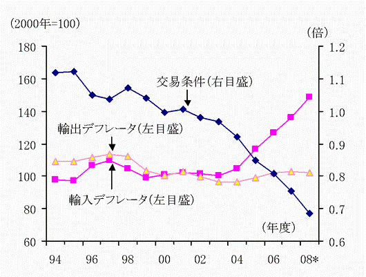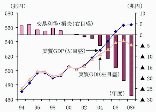 交易利得・損失(Trading Gains/Losses)とは、ある基準年から交易条件が変化することによって生じる、国内居住者の実質購買力(実質所得)の海外からの流入、あるいは海外への流出のことです。交易条件は、一定の輸出量と交換に購入できる輸入量が基準年と比べて何倍になっているかを表し、(輸出価格指数/輸入価格指数)で求められます。この値が小さくなることを、交易条件の悪化といいます。 近年、原油など資源価格高騰により交易条件が悪化しており、2008年度4〜6月期には年率28兆円(実質GDP比5%)の交易損失が発生しています。その分、国内居住者の実質購買力(実質所得)が海外への流出しているわけで、内需を抑制する要因として注目を集めています。 しかし、「2008年度4〜6月期の実質GDP564兆円(年率)のうち28兆円が資源高により失われた」といった評価の仕方は適切ではありません。*1 交易は売り手と買い手の双方に利得があるからこそ行うものであって、交易からどちらかが損失を被ることはありません。基準年を示さずに交易損失の金額の大きさを強調し、あたかも交易によって損失が生じているかのように評価することは適切ではないのです。現在、内閣府の国民経済計算は基準年を2000年と定めていますが、もしこれが2008年であれば、2008年の交易損失はゼロ、2000年の交易利得が28兆円になるのですから、交易利得・損失の数字は基準年とセットで読むことが大切です。つまり、「2008年4〜6月期の交易条件が基準年2000年から不変(1倍)であったなら得られたであろう実質購買力(実質所得)が、実際には交易条件が0.68倍に低下(悪化)したため年率28兆円の実質購買力(実質所得)が国内居住者から海外へ流出した」と評価することが適切です。