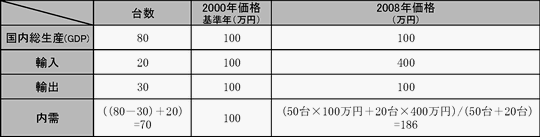 仮想例として、以下の図表3のように自動車という一財のみを生産、消費、貿易している世界を想定します。基準年の2000年、日本は80台の自動車を生産し、うち30台を海外へ輸出。また、海外から20台の車を輸入。内需は70台(=国内総生産80−輸出30+輸入20)とします。また、価格面では2000年に、輸出入、内需のすべてにおいて、車は1台100万円で取引されていたとします。それが、2008年、台数は不変。価格も輸出価格は不変で、輸入価格のみが400万円に4倍に跳ね上がったとします。
