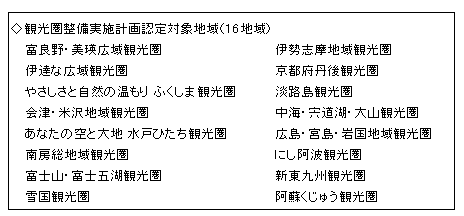 観光庁はまず、2008年7月に施行された「観光圏の整備による観光旅客の来訪及び滞在の促進に関する法律(観光圏整備法)」に基づいて、観光地が自治体の枠を越えて広域的に連携した「観光圏」を整備し、日帰りより経済波及効果の大きい滞在型や周遊型の観光インフラ整備に積極的に取り組む方針です。同庁発足後の10月3日には16地域を「観光圏」として指定し、補助金や融資、規制緩和などで支援し、広域観光の定着を目指します。