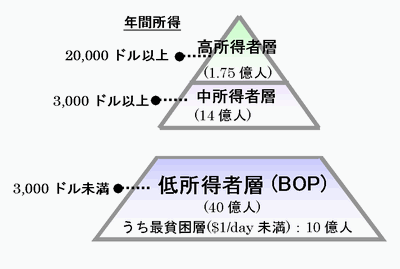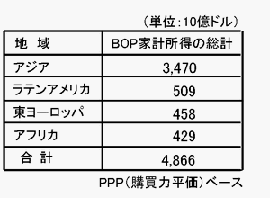 BOPとはBase Of the Economic Pyramidの略で、世界資源研究所および世界銀行グループの国際金融公社が2007年に共同発行した「THE NEXT 4 BILLION」の定義によれば、世界中の人々を所得階層で分類したピラミッド(図表1)の底辺に位置する年間3,000ドル未満の所得で暮らす低所得者層を指します。BOPの人口は世界で約40億人にのぼり、とりわけ中国とインドを含むアジアに過半が存在しています(図表2)。このBOPの家計所得を総計すると、PPP(購買力平価)ベースで年間約5兆ドル(図表3)と推計されており、BOPは非常に大きな潜在的市場の一つとみなされつつあります。