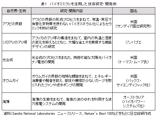 バイオミミクリは、企業や大学の研究開発部門において、現在、急速に成長している分野となっています。自然界の仕組みに学ぶ技術の開発促進活動の一つとして、国連環境計画(UNEP)、国際自然保護連合(IUCN)、ZERI財団合同によるプロジェクト「Nature’s Best 100」(世界3,000以上のバイオミミクリ関連技術の中から最も優れた100を紹介する活動)なども実施されています。