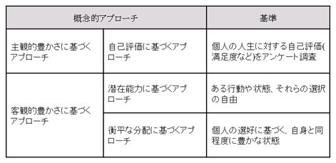 前者は人生をさまざまな「機能(行動、状態)」と「機能を選択する自由」の組み合わせであるとみなし、評価するものです。「機能」の例としては、健康であること、知識や職を有することなどが挙げられます。さらに、「機能を選択する自由」があることが、豊かであると考えます。
