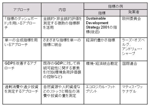委員会は、新たな指標作成に向けたアプローチも提案しています。その際、(1)現在の豊かさを表わす指標群と、それを(2)将来世代に引き継ぐことができるか否かという問題(持続可能性)を表わす指標群の両者を明確に区別し、混同しないようにしています。前者の測定方法として主観的豊かさに基づくアプローチと客観的豊かさに基づくアプローチを提案し、両者の併用が必要であるとして、3つのアプローチを提案しています。また、持続可能性の測定方法として、4つのアプローチを提案しています。